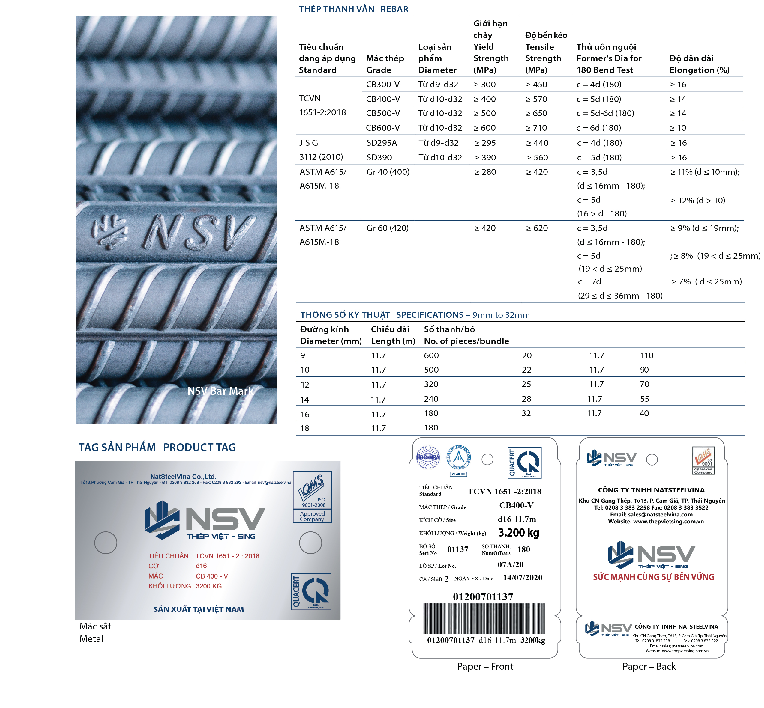 | Bề mặt | Dập nổi các dấu hiệu riêng của thép Việt Sinh: Logo NSV, đường kính, mác thép. |