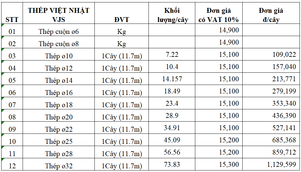 BẢNG GIÁ THÉP VIỆT Ý