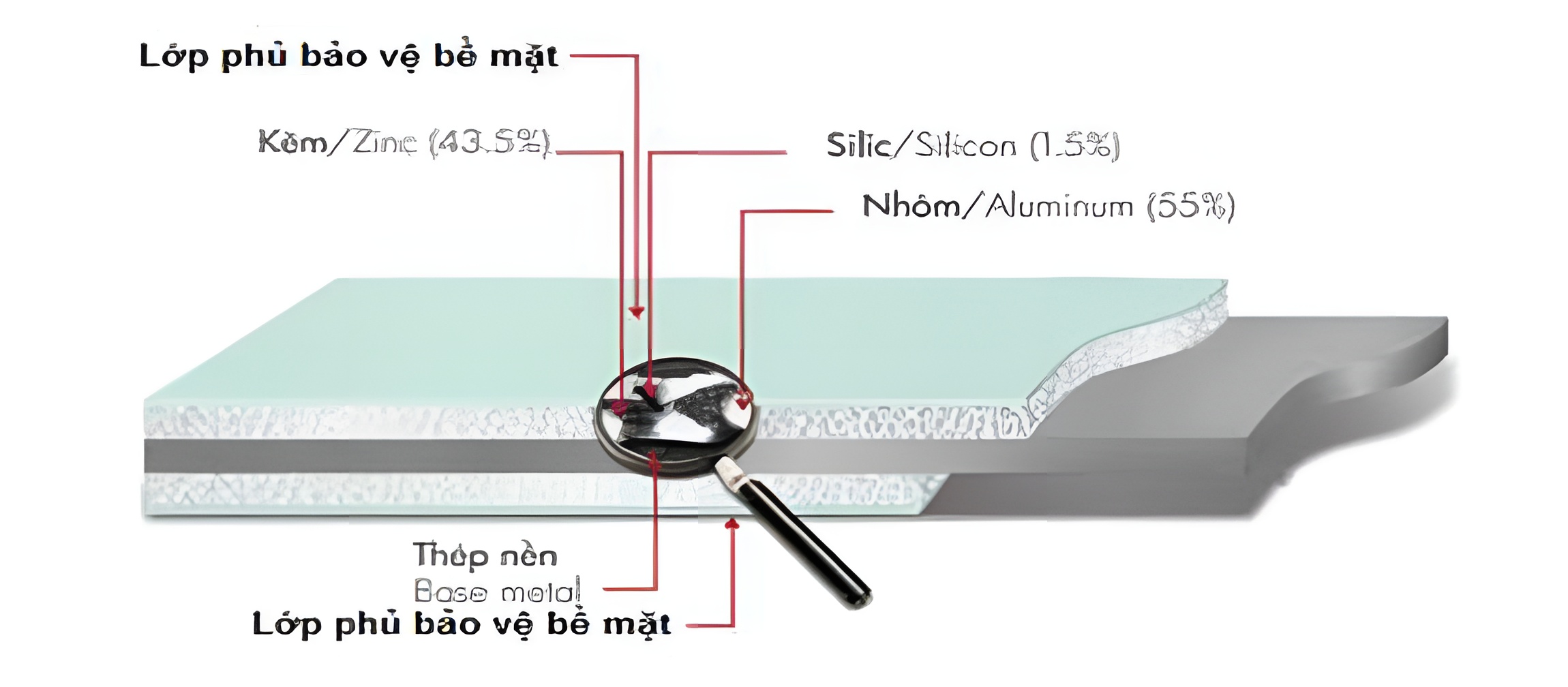 • Lớp mạ hợp kim nhôm kẽm: Lớp này giúp chống ăn mòn, chống gỉ sét và tăng tuổi thọ cho sản phẩm, có khả năng chịu được ảnh hưởng từ môi trường khắc nghiệt như ẩm ướt, acid, muối.